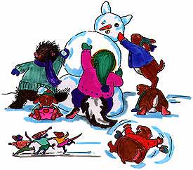 After the bird-feeding Sam went out on his sledge. Sometimes Bill and Tom and Ann rode with him. Badger had made the sledge, but he never rode on it himself. He was too old and dignified, but he enjoyed watching the four pigs career down the field and roll in a heap at the bottom.